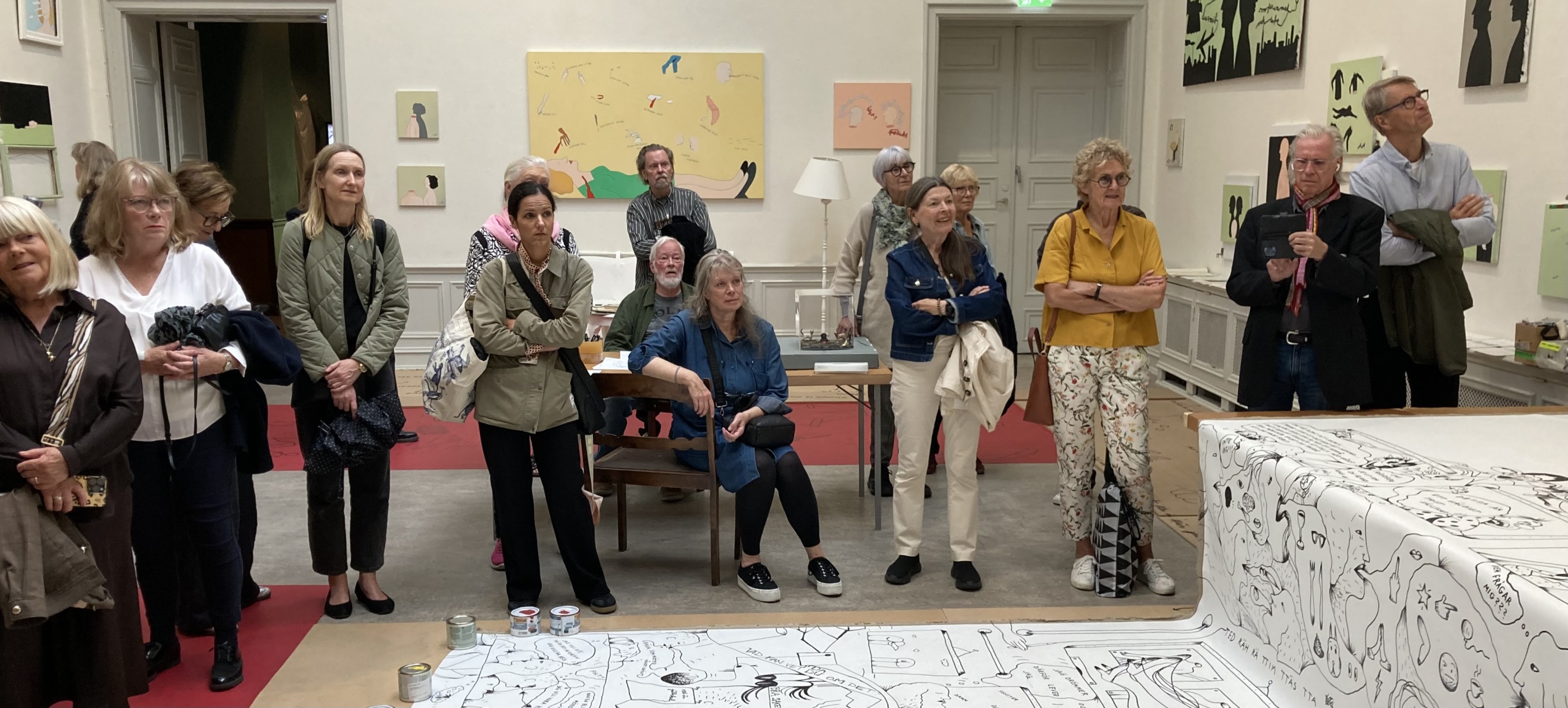 Vi fick en initierad och inspirerande guidning på Konstakademien av Mikael Storåkers på C F Hill då han berättade om hur han har intervjuat Marie Louise Ekman inför den utställningskatalog som producerats för utställningen och Mikael gav oss en fördjupad insikt om hur Marie Louise tänker. Hennes arbeten visades i fyra salar där några golv var målade i pastellfärger och ett annat täckt med fotografier. På väggarna hängde hennes nya stora målningar och i taket i en av salarna en ljuskrona i glas 3,8 meter hög!